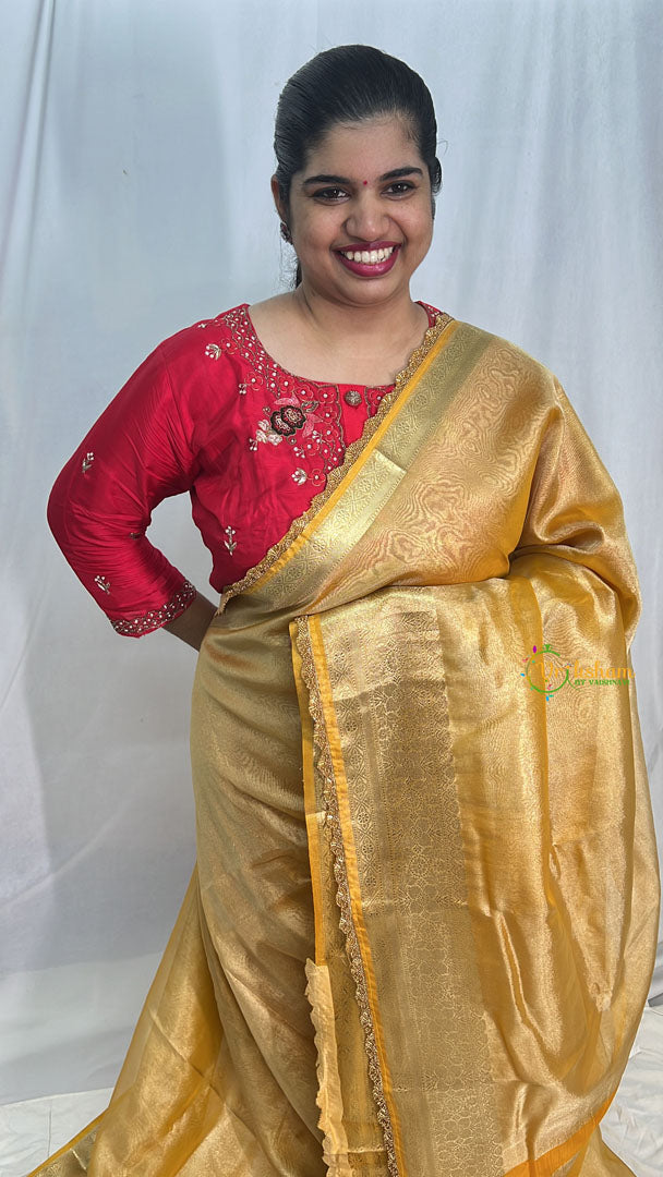 Elevate your style with the ethereal Golden Color Janhvi Kapoor's Organza Saree. Made of high-quality Shiny Kora Organza material, this handloom saree is adorned with intricate zardosi work lace and border, as seen on Janhvi Kapoor. Embrace the graceful elegance of this saree and make a statement at any occasion.