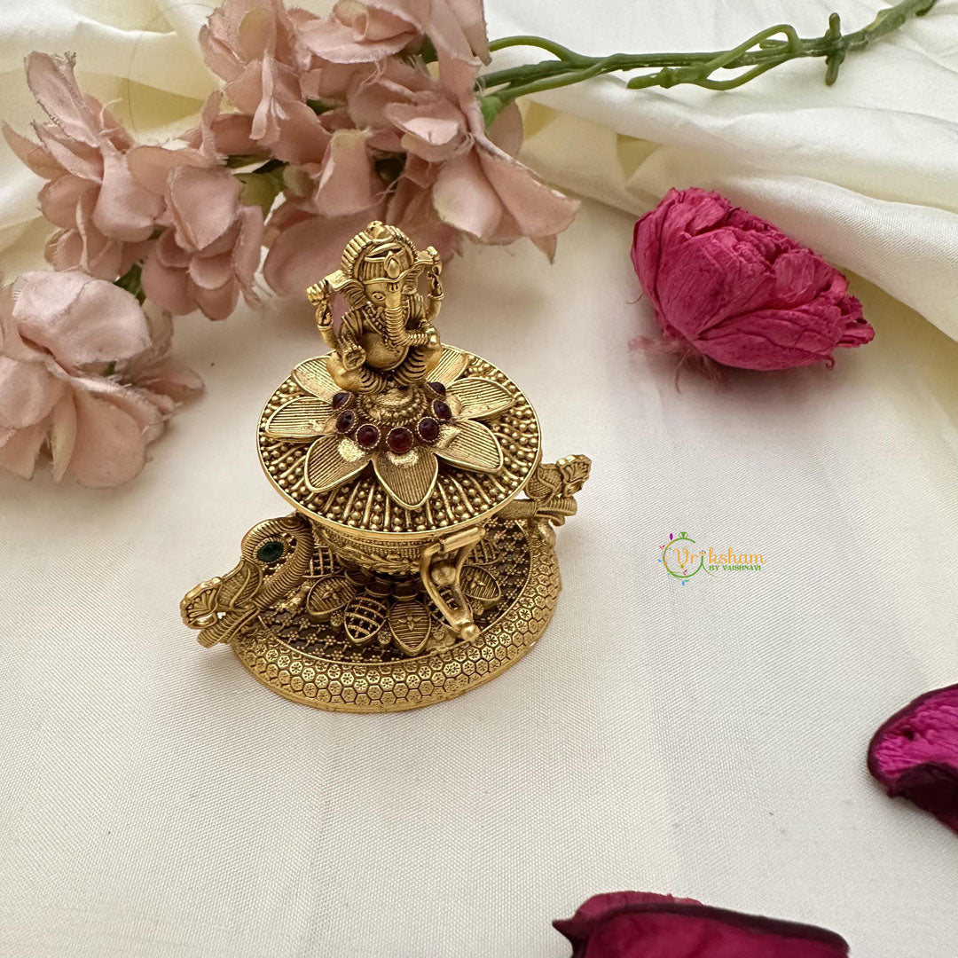 Introducing our Golden Polish Ganesha Kumkum Box, a masterpiece of art and luxury. Made with a golden polish, this box is perfect for storing your ceremonial kumkum. The intricate detailing of Ganesha, the god of wisdom, adds a touch of elegance to your religious rituals.