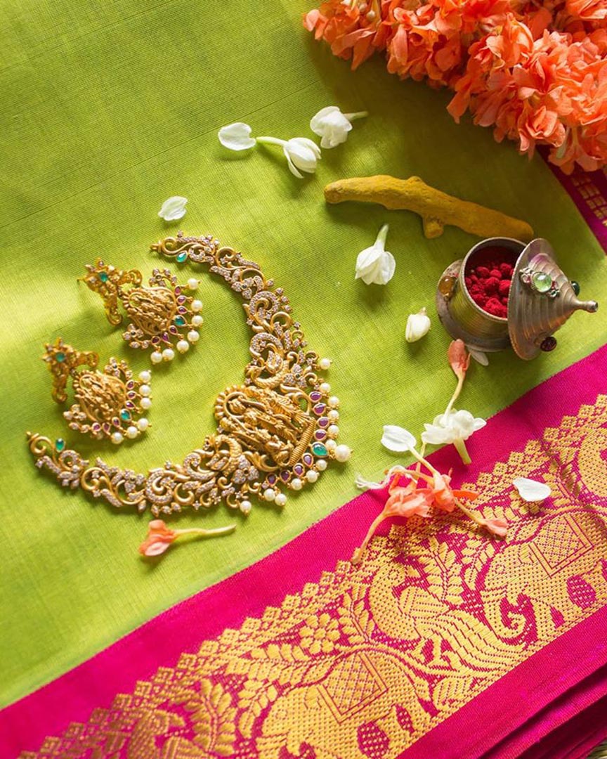 Golden Short Neckpiece with Ram Paatabisegam with some pearl drops
