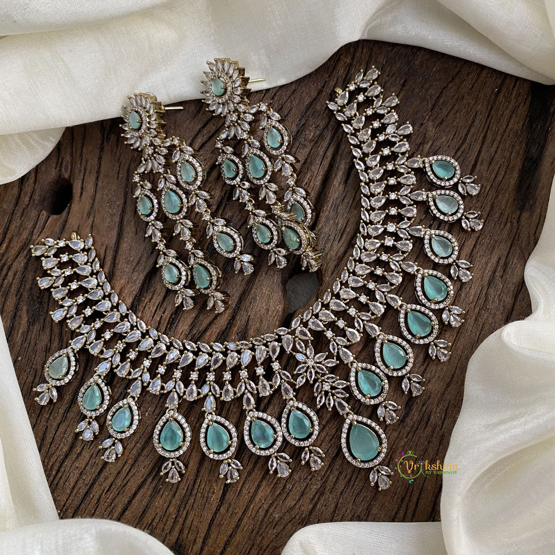 Graceful Bridal Victorian Diamond High Neck Choker Aqua Green - Adorned with exquisite Aqua Green diamonds and intricate detailing, our bridal jewelry is a tribute to the grace and sophistication of bygone times. From ornate necklaces to delicate earrings and enchanting tiaras, every piece is crafted to perfection, making it the perfect accompaniment to your special day. Elevate your bridal ensemble with our Victorian diamond jewelry ; comes with pair of matching earring.