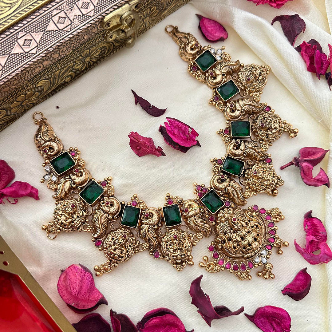 Indulge in luxury and elegance with our Green AD Stone 1 gm Gold Lakshmi Neckpiece. Featuring intricate green AD stones and a beautiful Lakshmi pendant, this necklace exudes sophistication and exclusivity. Crafted with 1 gm gold, it adds a touch of glamour and opulence to any outfit. Elevate your style game with this stunning piece.