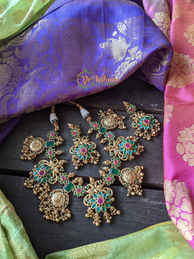 Green AD Stone Lakshmi Coin Choker - Green AD stone flower interludes and lakshmi coin with ghungroos pattern. Comes with matching ear hangings.