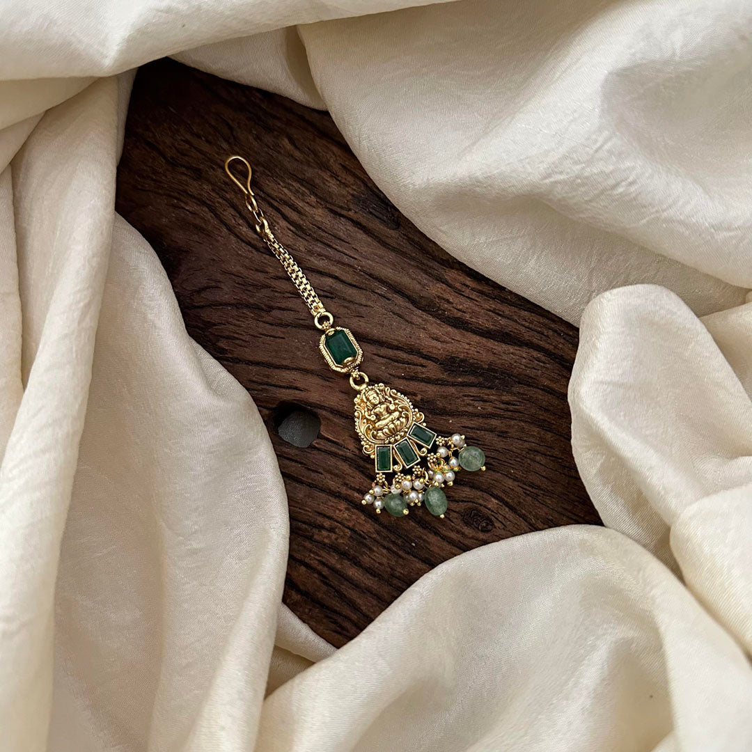 Elevate your style with our elegant Green AD Stone Lakshmi Maang Tikka. Crafted with exquisite green stones and adorned with aqua green beads and pearls, this Maang Tikka adds a touch of luxury to any outfit. Embrace the beauty and sophistication of this exclusive piece.