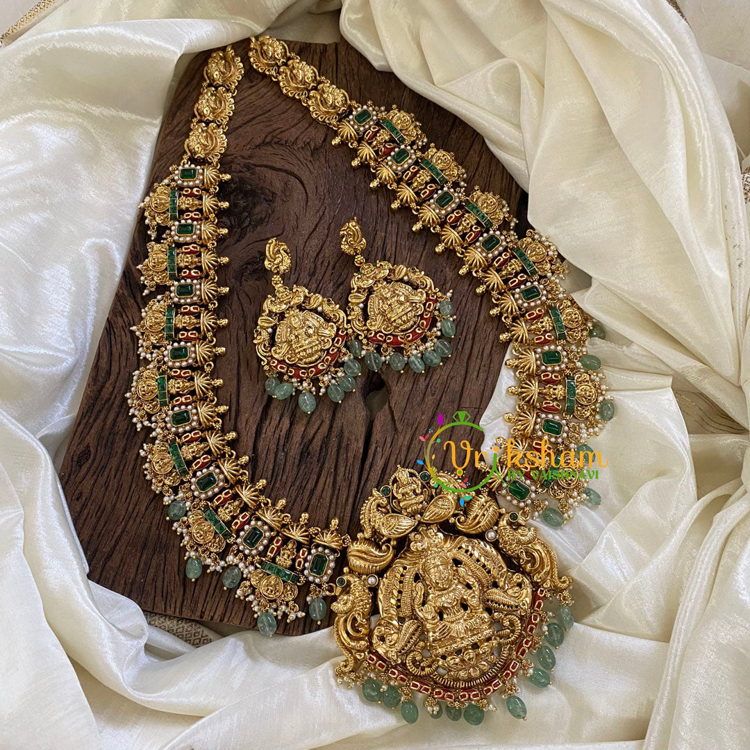 Premium Green AD Stone Temple Haram - Lakshmi Haram-Pastel Green Bead-Intricately Designed Temple Neckpiece ad stone ; lakshmi pendant; comes with matching ear earrings.