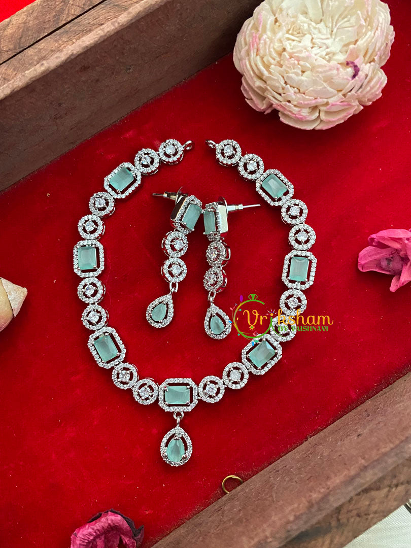 Pastel Green American Diamond Neckpiece with Tear Drop Pendant–WHITE TONE imitation jewelry set; Comes with a pair of similar danglers.