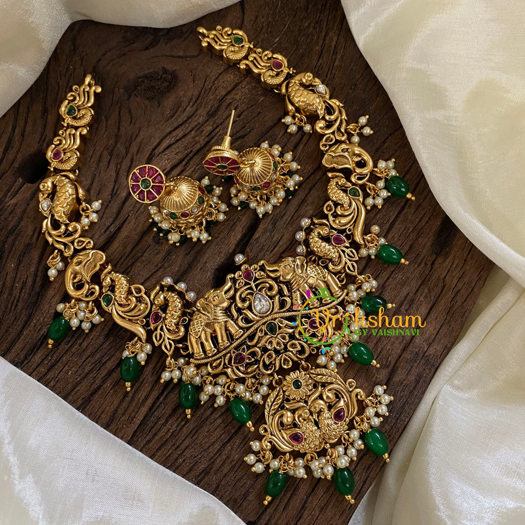 Green Bead Antique Choker Short Neckpiece - imitation AD stone studded premium gold alike polish and finish choker/short neckpiece; come with earrings.