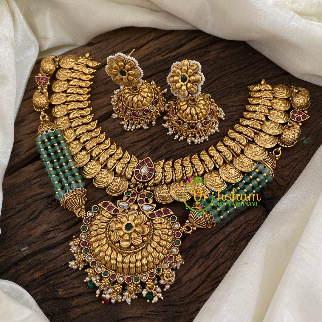 Green Bead Designer Short Neckpiece - premium quality polish and imitation stones neckpiece, comes with matching earrings.
