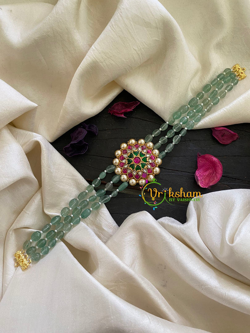 Jadau Kundan Green Bead High Neck Choker- semi precious kundan stones with jadau work and bead finish. Neckpiece only.