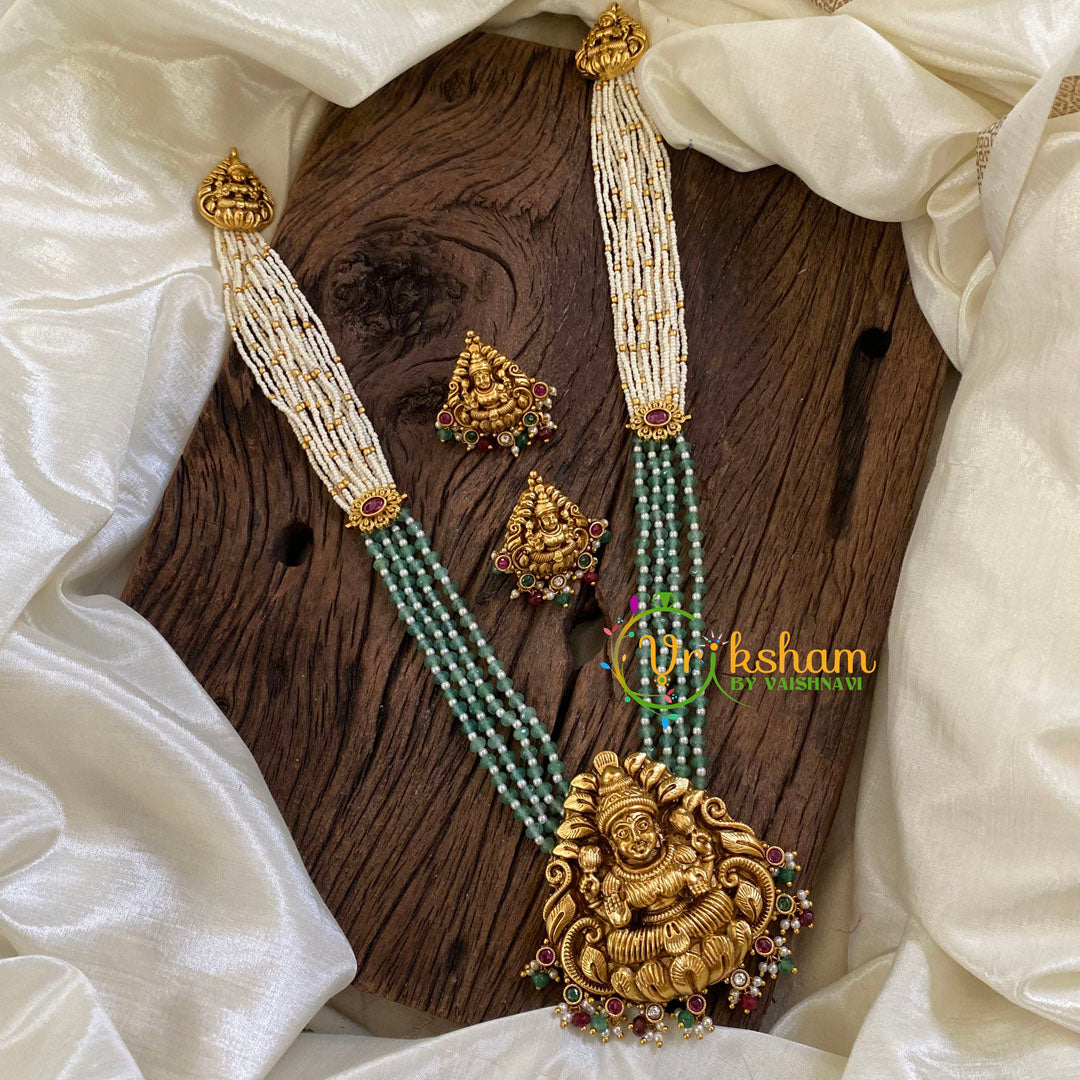 White and Pastel Green Bead Lakshmi Pendant Haram with Mogappu - Lakshmi haram ; lakshmi pendant and mogappu; comes with matching ear earrings.