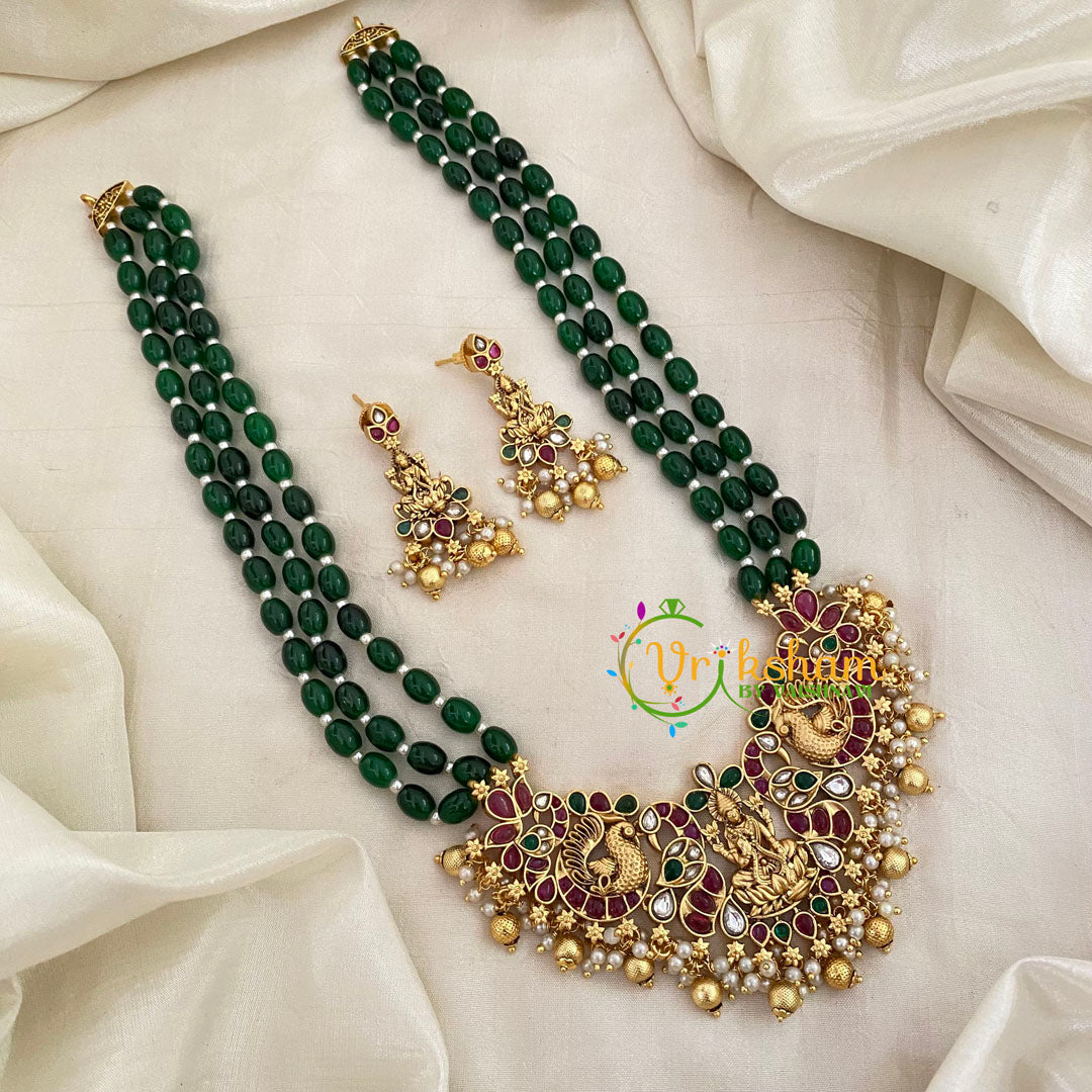 3 Layered Green Bead Lakshmi Pendant Malai - with red green ad stone lakshmi pendant exquisite mid length haram.