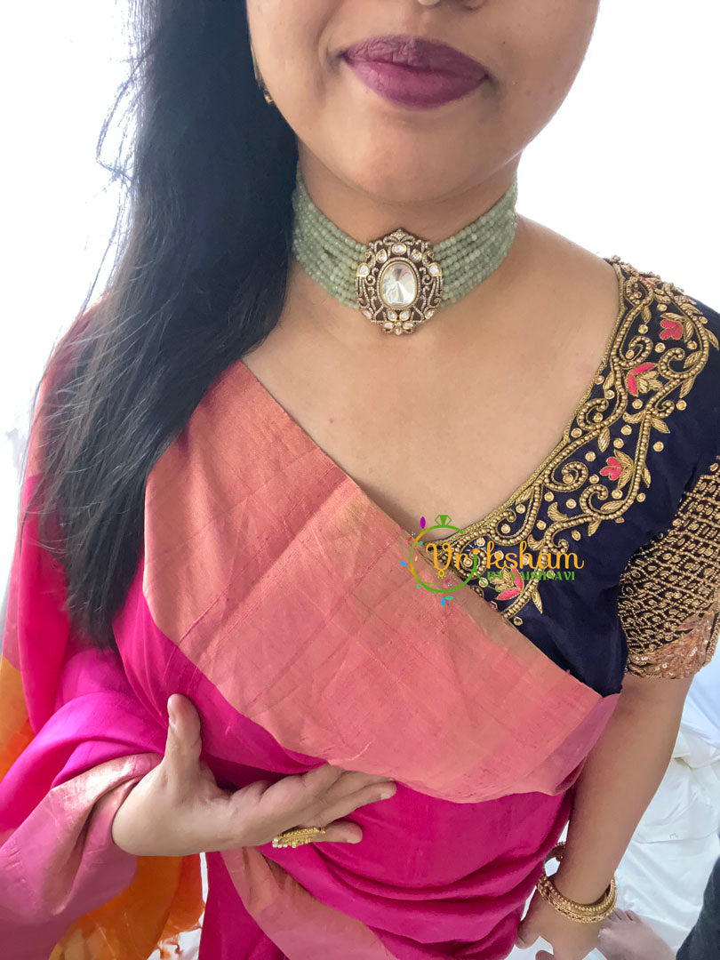 Pastel Green Bead Victorian Diamond Choker - White precious stone studded green high neck choker royal jewelry; comes with matching ear studs.