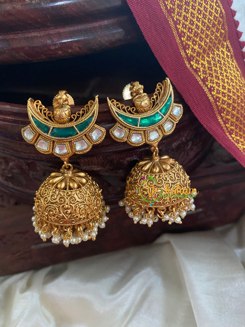 Green Kemp Chandbali Jhumkas -Premiium matt finish Cluster pearl huge Chandbali Jhumkas.