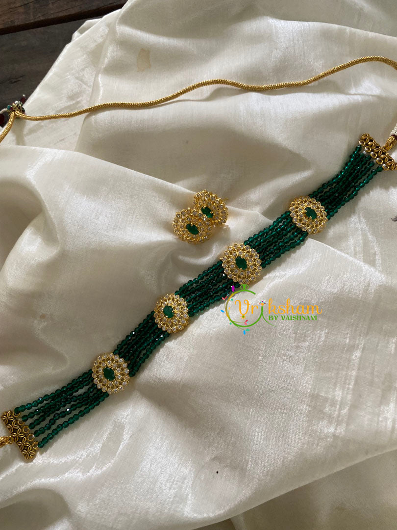 AD Stone Pendant in Green Crystal Bead Choker –5 layers of crystal beads and green ad stone 4 pendant high neck choker; comes with matching ear studs.