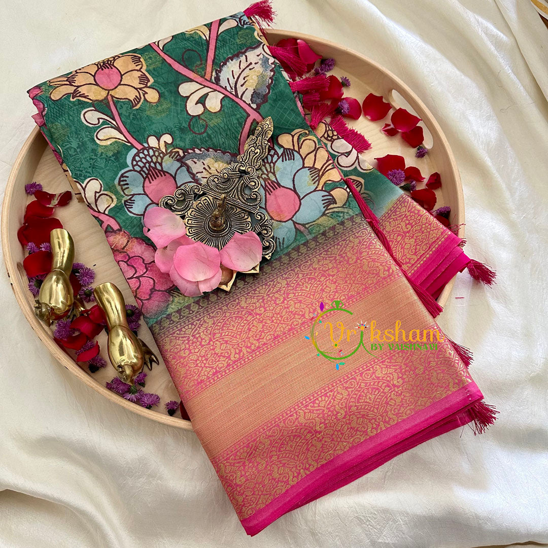 Green Kalamkari Saree –Semi Soft Silk Saree- Festive wear saree – kalamkari print work throughout the saree; comes with Blouse attached. Two side traditional kanchi border.