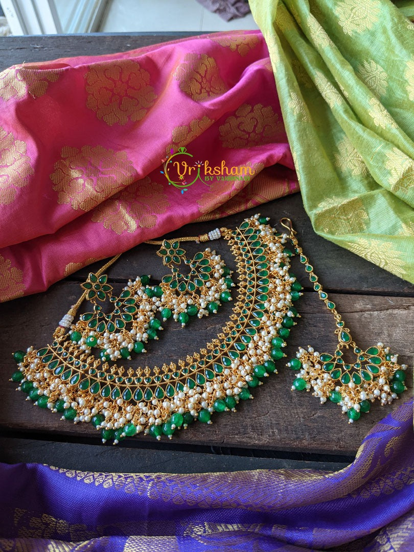Green Kemp Choker with earrings and Tikka -short neckpiece with green bead finish, comes with matching ear danglers and maang tikka.
