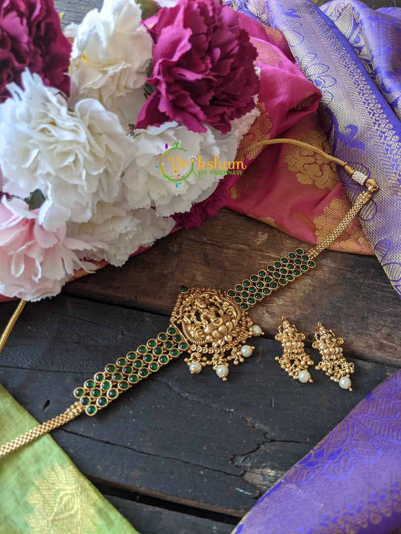 Green Kemp Lakshmi High Neck Choker -Three layered green kemp with chain ends and Centre Lakshmi Pendant and pearl finish, comes along with Lakshmi studs.