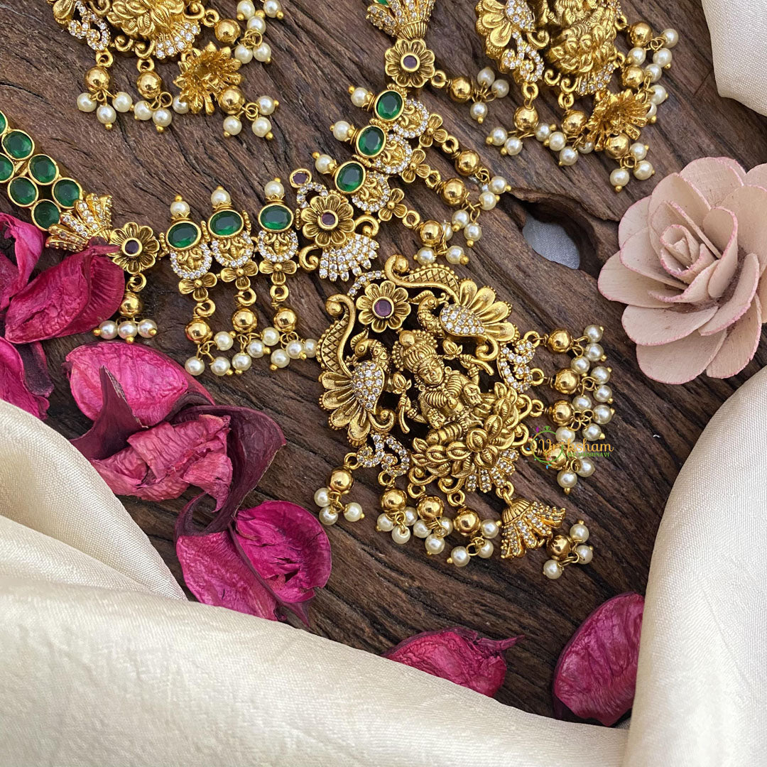 Precious Green Kemp Lakshmi Neckpeice –White and Green stone studded neckpiece with matching earrings; PEARL and golden bead FINISH; comes with matching danglers.