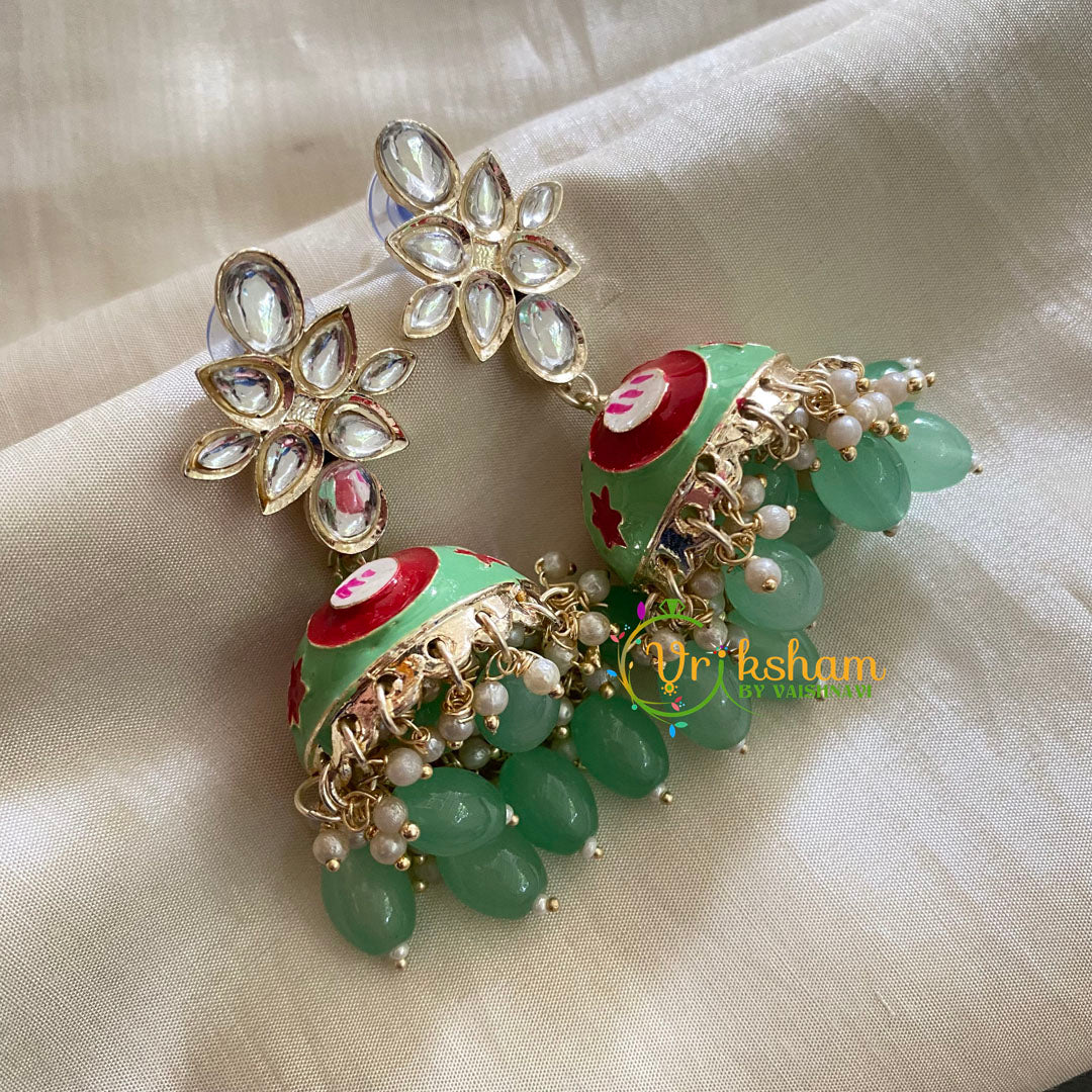 Pastel Green Kundan Meenakari Jhumkas-Hand painted-kundan Stud with hand painted Jhumkas base. Bead and Pearl finish. Medium size.