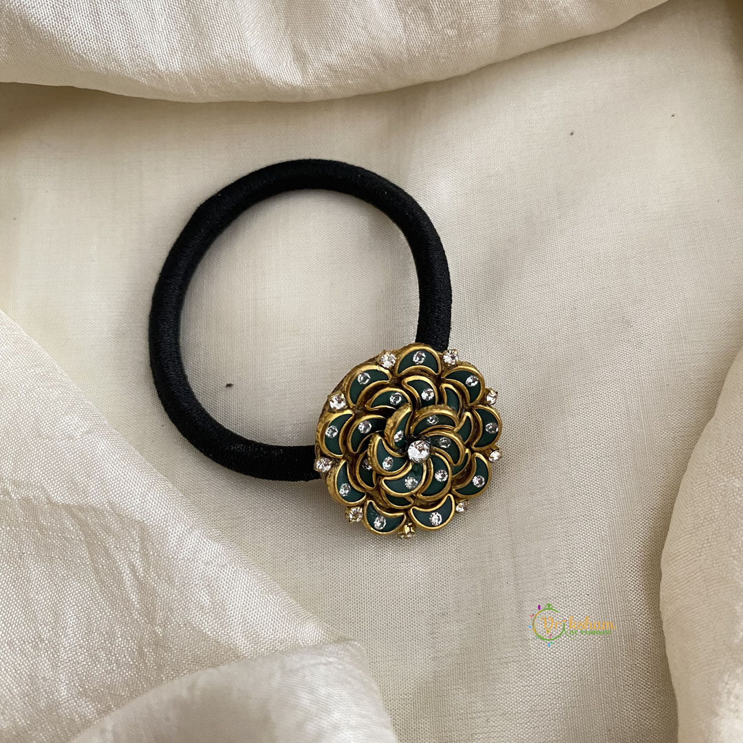 Green Kundan Pendant Rubber Band - Flower - semi precious stone -Festive Wear Hair bands-premium gold like polish pendant.