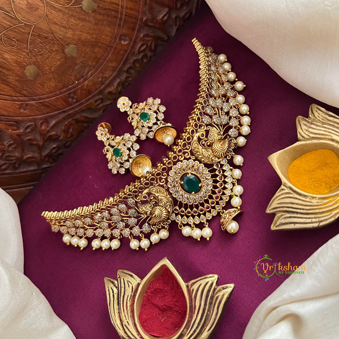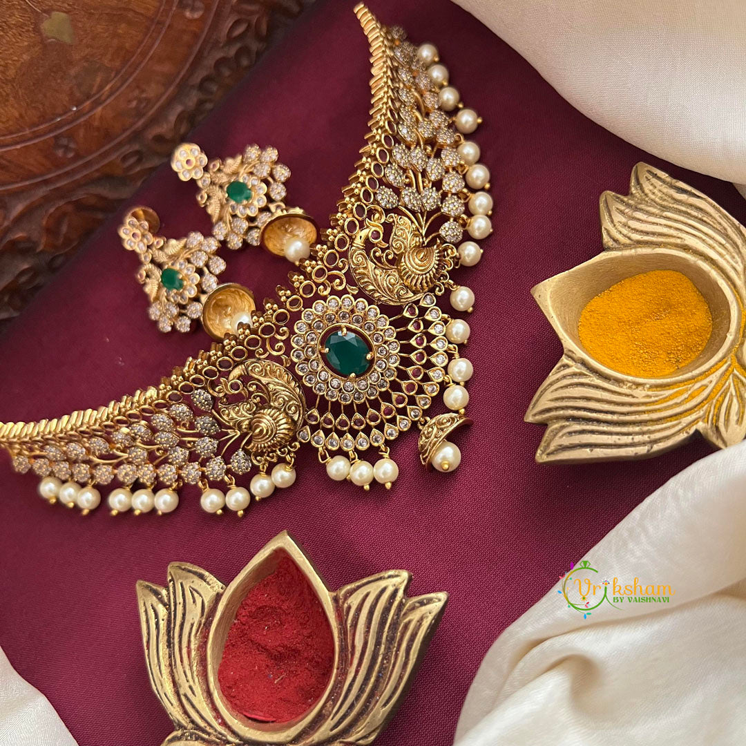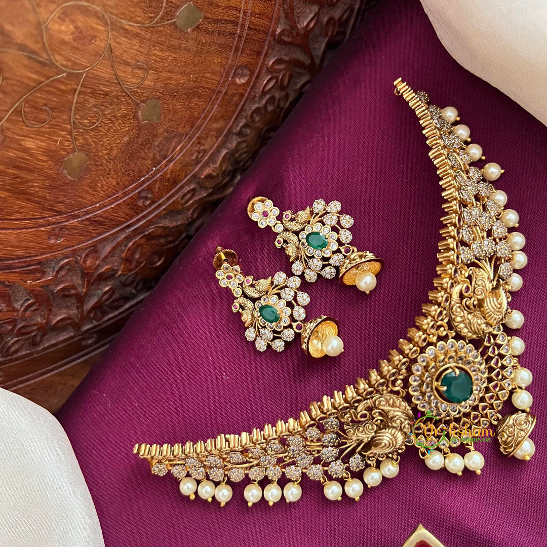 Elevate your traditional look with this stunning Green Stone AD Peacock Style Choker Neckpiece, a perfect blend of heritage craftsmanship and contemporary sparkle. Featuring intricate peacock motifs adorned with vibrant green stones and shimmering AD crystals, this choker sits gracefully on an ornate hasli base that commands attention.