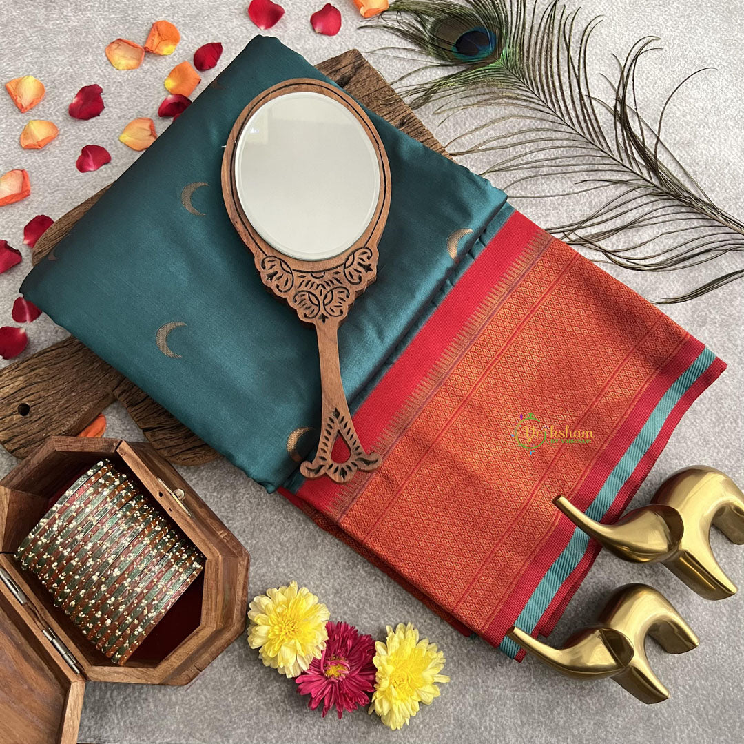 Elevate your elegance with our Green With Red Border Chandrakor Tana Katan Silk Paithani Saree. Made with luxurious silk, this saree features a unique nath pallu, adding a touch of sophistication to your style. Wrap yourself in comfort and grace with this exclusive piece.