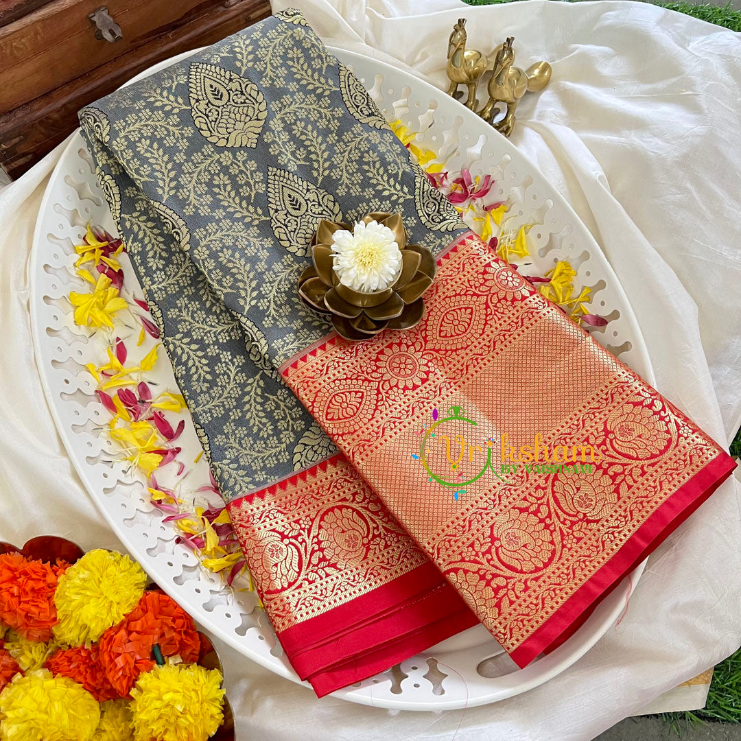 Grey Black with Red Border Silk Saree - Festive wear kanchi silk saree – Vanasingaram pattern throughout the saree; comes with Blouse attached. One side Big Border and other side lean border. Power loomed saree.