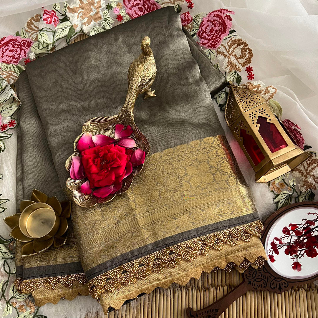 Elevate your style with the ethereal Grey Color Janhvi Kapoor's Organza Saree. Made of high-quality Shiny Kora Organza material, this handloom saree is adorned with intricate zardosi work lace and border, as seen on Janhvi Kapoor. Embrace the graceful elegance of this saree and make a statement at any occasion.