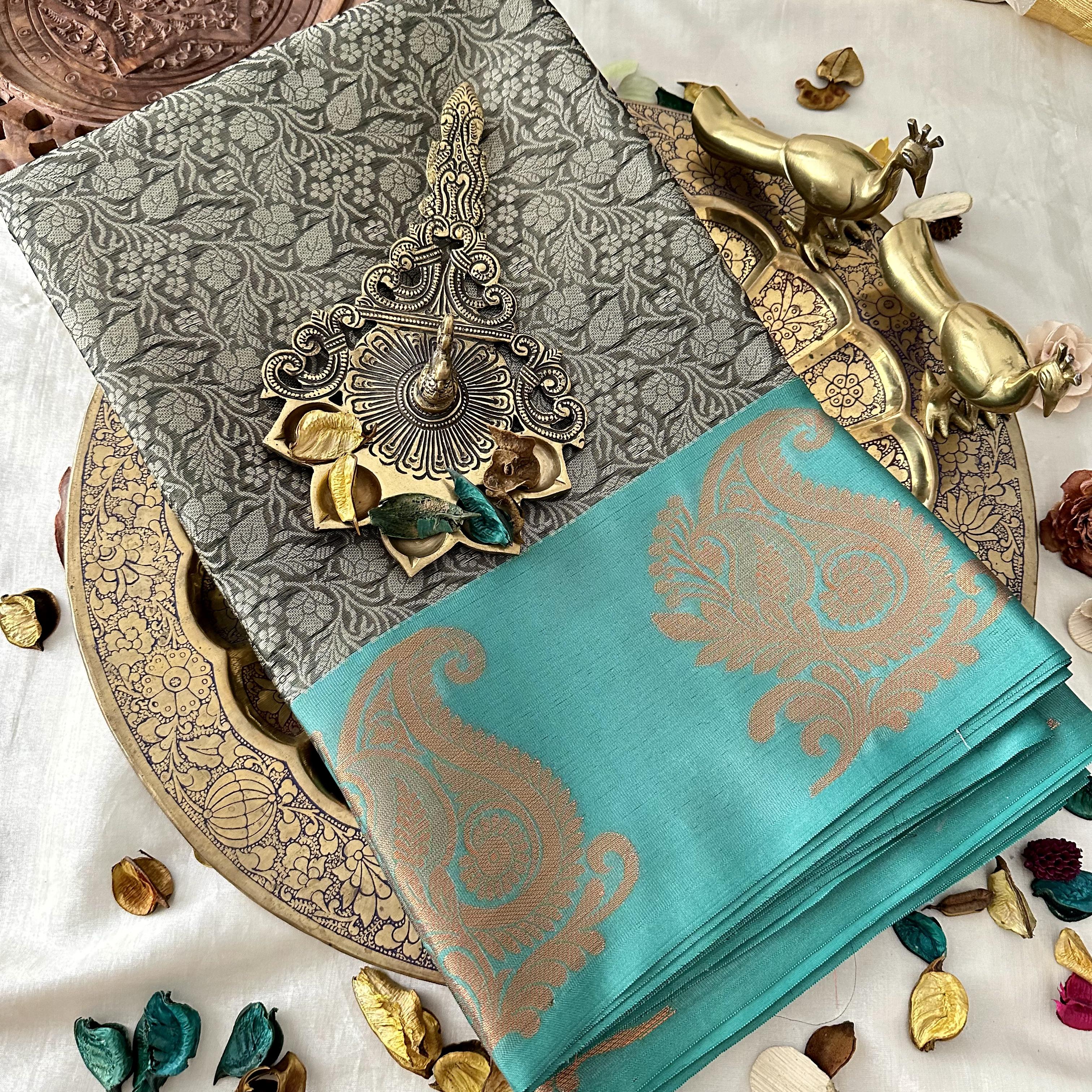 Grey Color Kora Muslin Saree – Festive wear Kora Muslin saree manufactured in Varanasi –designer printed throughout the saree and ; comes with Blouse attached.