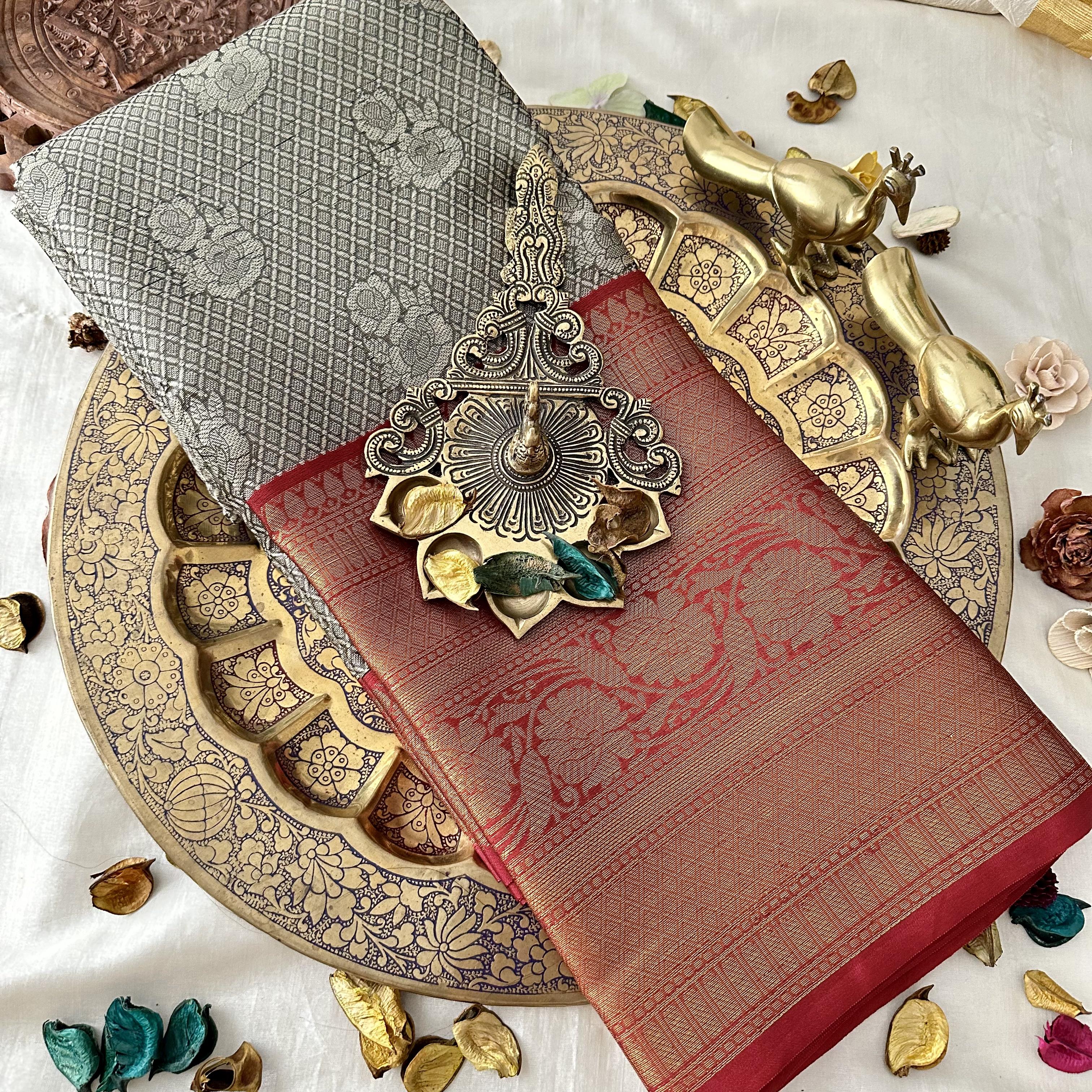 Grey Kora Muslin Saree with Red Border – Festive wear Kora Muslin saree manufactured in Varanasi –designer printed throughout the saree ; comes with Blouse attached.