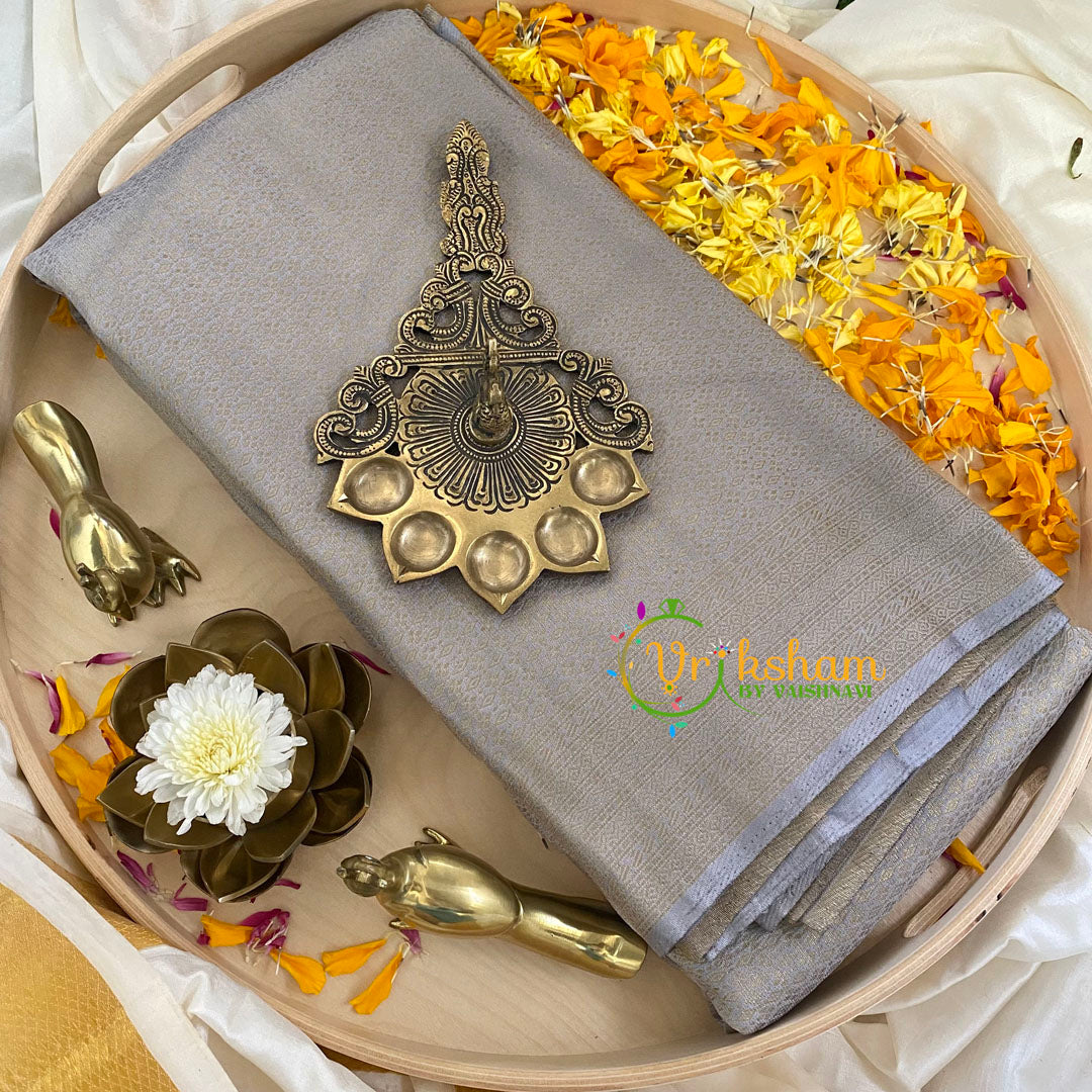 Grey Kuber Silk Saree -Kubera Pattu- Festive wear saree – Self design unicolor pattern body throughout the saree; comes with Blouse attached.
