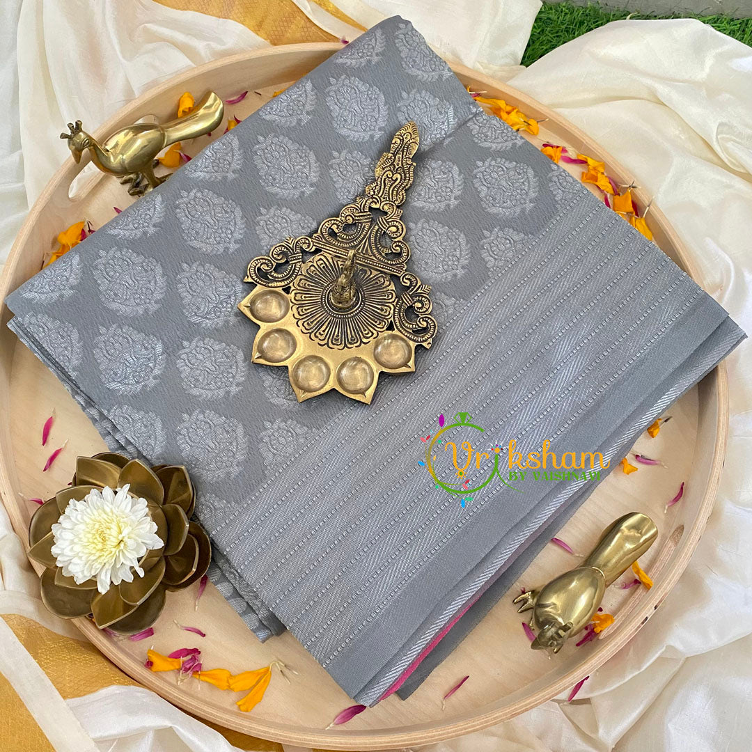 Grey Litchi Silk Saree- Festive wear saree – Medium size motif pattern throughout the saree; comes with Blouse attached. White Thread work. Medium border saree.