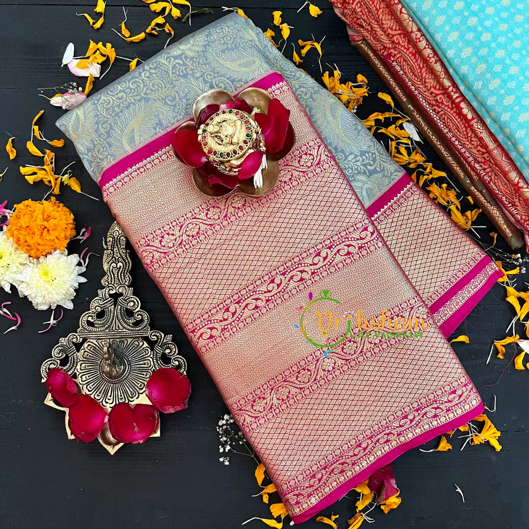 Grey with Pink Kanchi Silk Saree – Festive wear saree – Pattern throughout the saree; comes with Blouse attached. One side Big Border and other side lean border. Power loomed saree.
