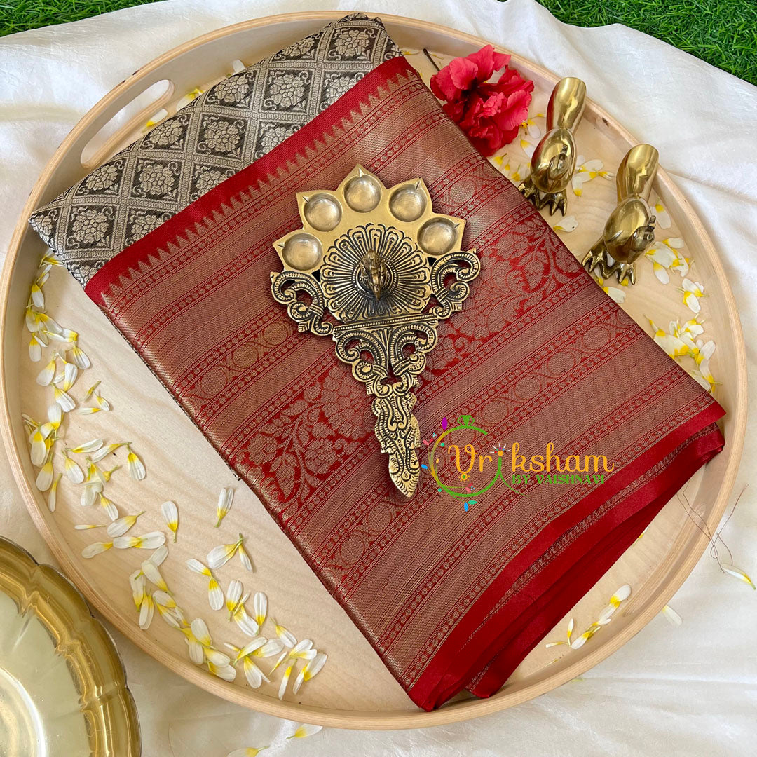 Grey with Red Kora Muslin Saree- Festive wear saree – self work throughout the saree; comes with Blouse attached. Two side border and pallu.