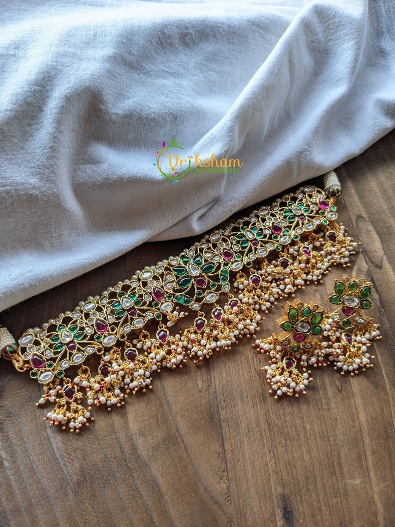 Guttapusalu Choker -Gold Look Alike Kemp and Kundan High Neck Choker -predominantly green white and red kemp and kundan stone studded with guttapusalu pearl finish. Comes with matching studs.