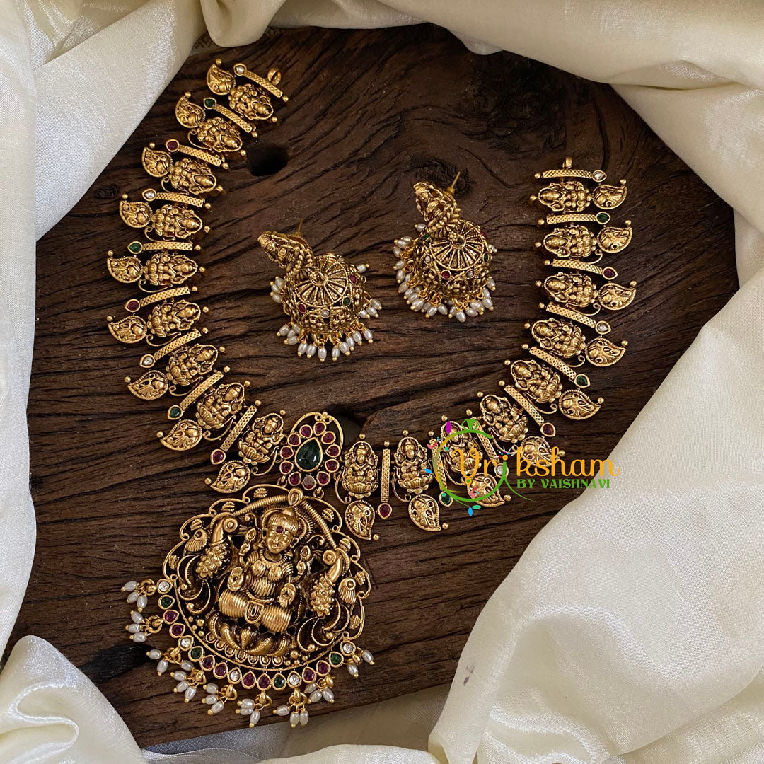 Guttapusalu Lakshmi Pendant Short Neckpiece- premium quality polish and stones neckpiece, comes with matching earrings. Rice Pearl finish.