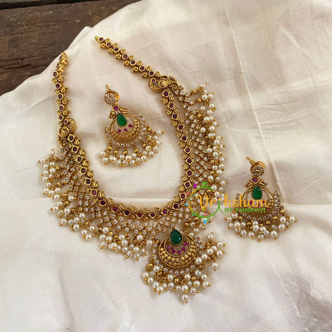 AD Stone Pendant Guttapusalu Short Neckpiece - AD Stone studded lean neckpiece with pendant, green and white ad stone pendant; comes with danglers.