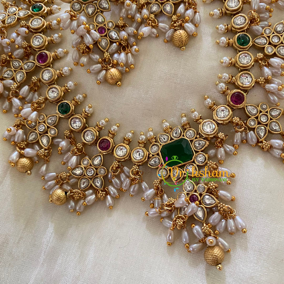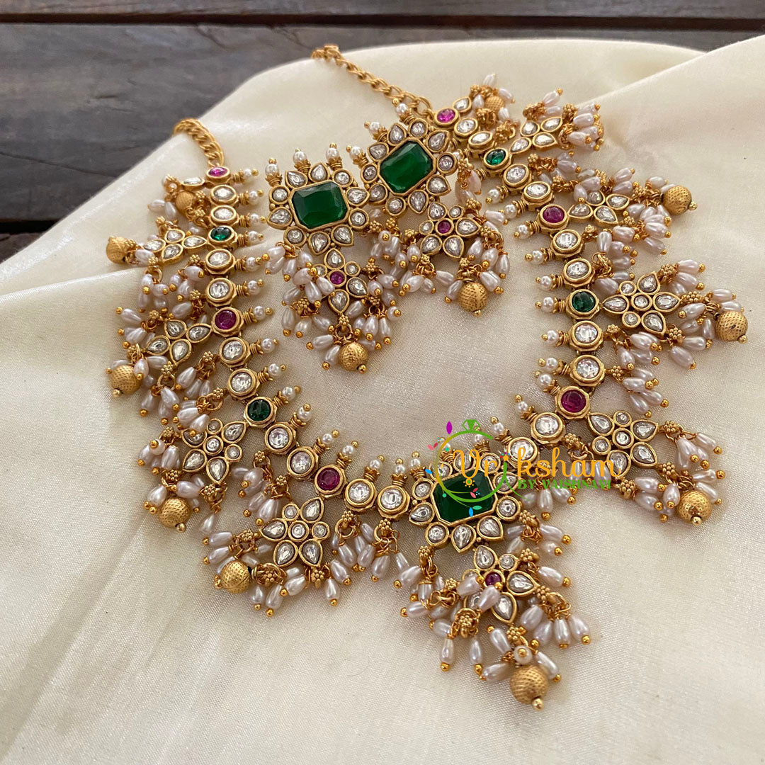 AD Stone Pendant Guttapusalu Short Neckpiece - AD Stone studded lean neckpiece with pendant, green red and white ad stone pendant; comes with danglers.
