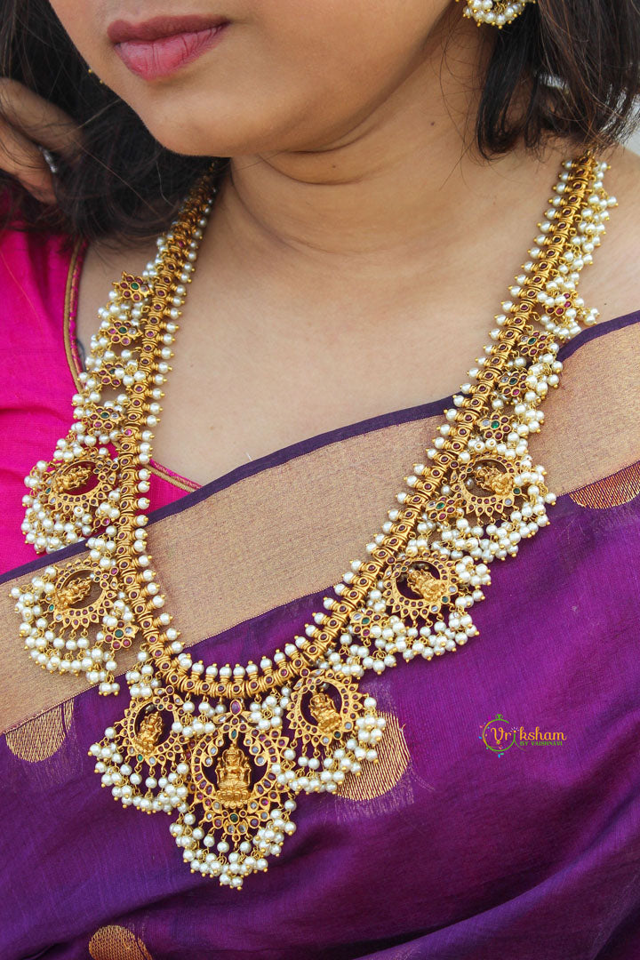 Premium Guttapusalu Temple Lakshmi Haram -Red green and white stone studded haram with cluster pearl Guttapusalu. Exquisite looking temple jewelery with premium quality matt finish. Comes with pair of ear hangings.