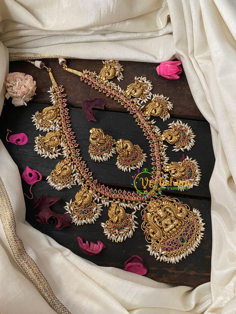 Premium Guttapusalu Temple Lakshmi Haram -Red green and white stone studded haram with cluster pearl Guttapusalu. Exquisite looking temple jewelery. Comes with pair of ear hangings.