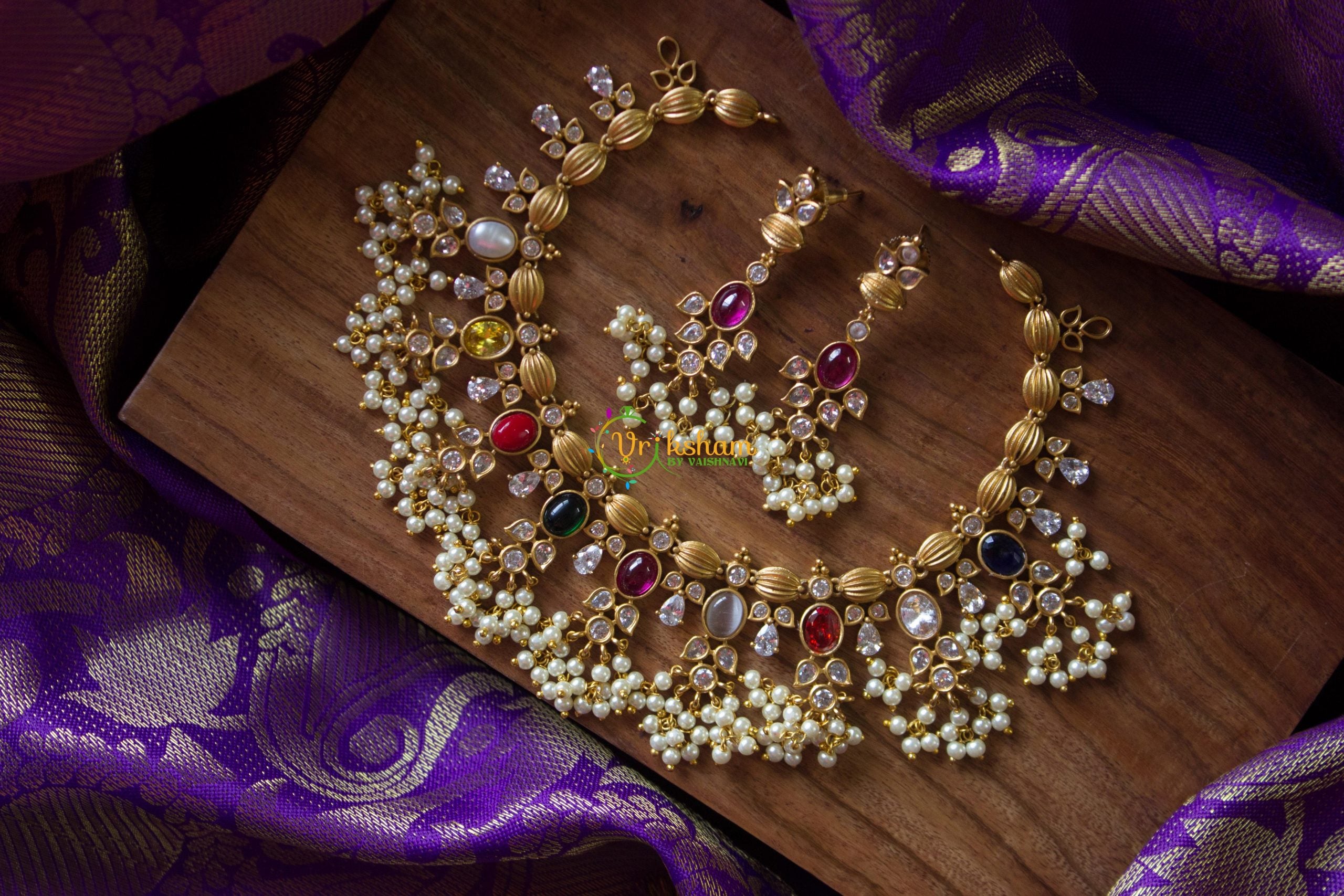 A traditional south Indian Jewelry with a modern design to it, which has a very generous amount of Pearls that is designed for any occasion for a women. Navratna is something that's trending right now and finding Navratna in a Guttapusalu is something that's very unique and impressive