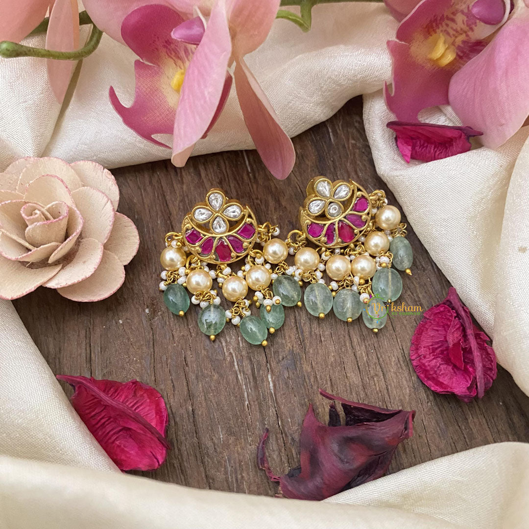 Indulge in luxury with our Half Moon Jadau Kundan Earrings. The exquisite combination of off-white pearls and green beads creates an aura of sophistication. Elevate any outfit with these elegant and exclusive earrings.