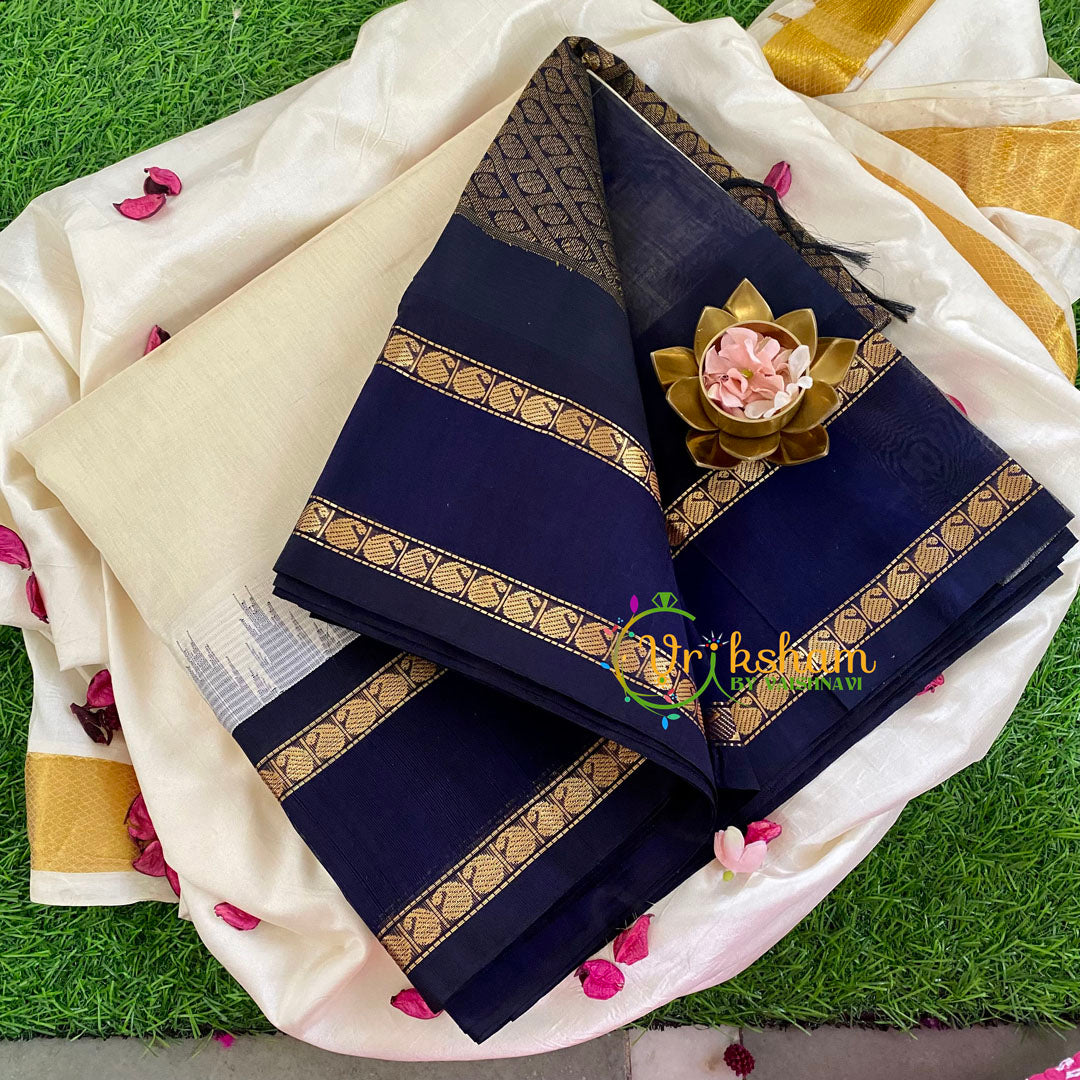 Half White and Dark Blue Border Saree- Festive wear saree –Plain Pattern throughout the saree; comes with Blouse attached. Two side contrast border and pallu.