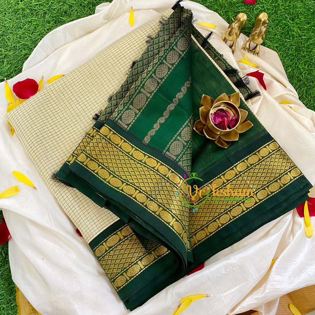 Half White and Forest Green Saree- Festive wear saree –Plain Pattern throughout the saree; comes with Blouse attached. Two side contrast border and pallu.