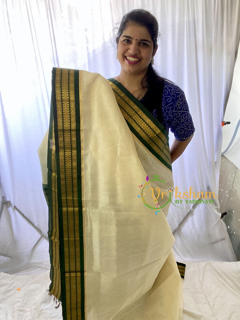 Half White Silk Cotton Saree with Dark Green Border - Plain Festive wear saree ; comes with Blouse attached. Two side contrast border and pallu.