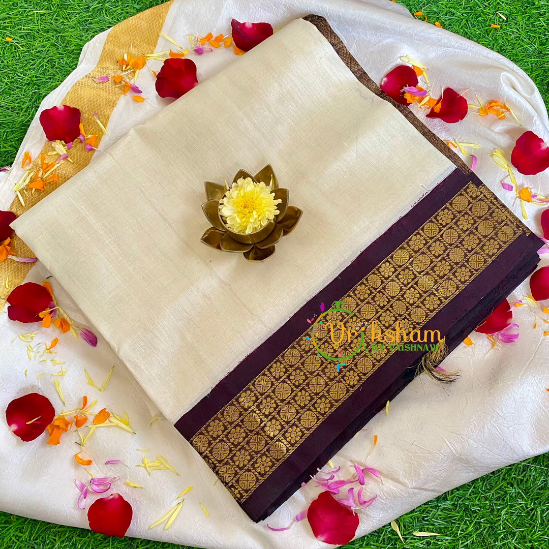 Half White with Brown Silk Cotton Saree-Korvai Handloom Saree -Festive wear saree –Plain Pattern throughout the saree; comes with Blouse attached. Two side contrast border and pallu.