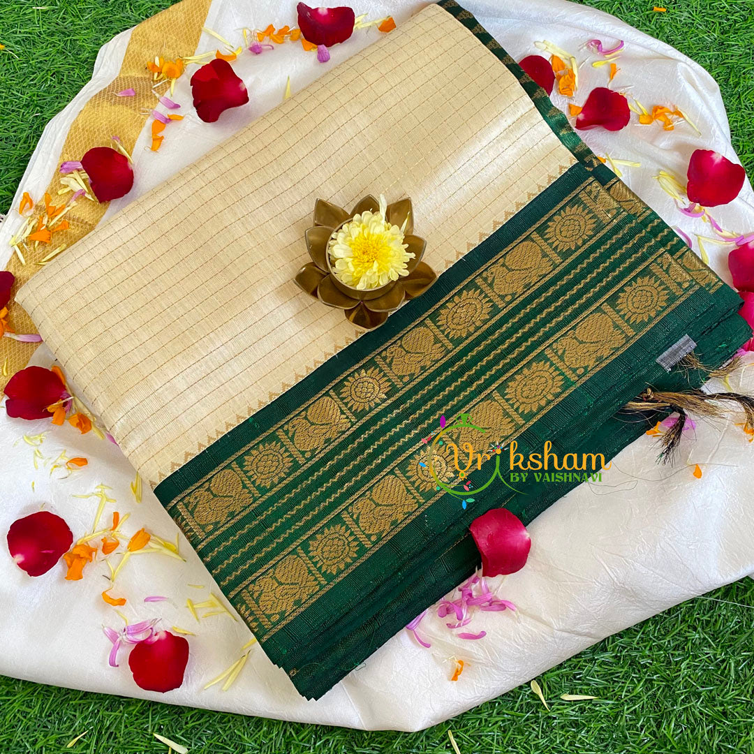 Half White with Green Silk Cotton Saree-Handloom Saree -Korvai Festive wear saree – Podi kattam Pattern throughout the saree; comes with Blouse attached. Two side contrast border and pallu.