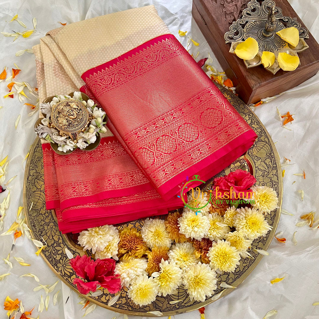 Half White with Pink Border Silk Saree - Kanchi Silk Saree – Festive wear silk saree – saree; comes with Blouse attached. Power loomed saree.