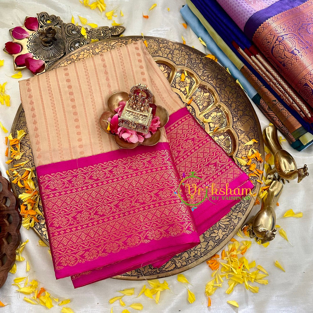 Half White with Pink Kanchi Silk – Festive wear saree – Butta Line Pattern throughout the saree; comes with Blouse attached. Power loomed saree.