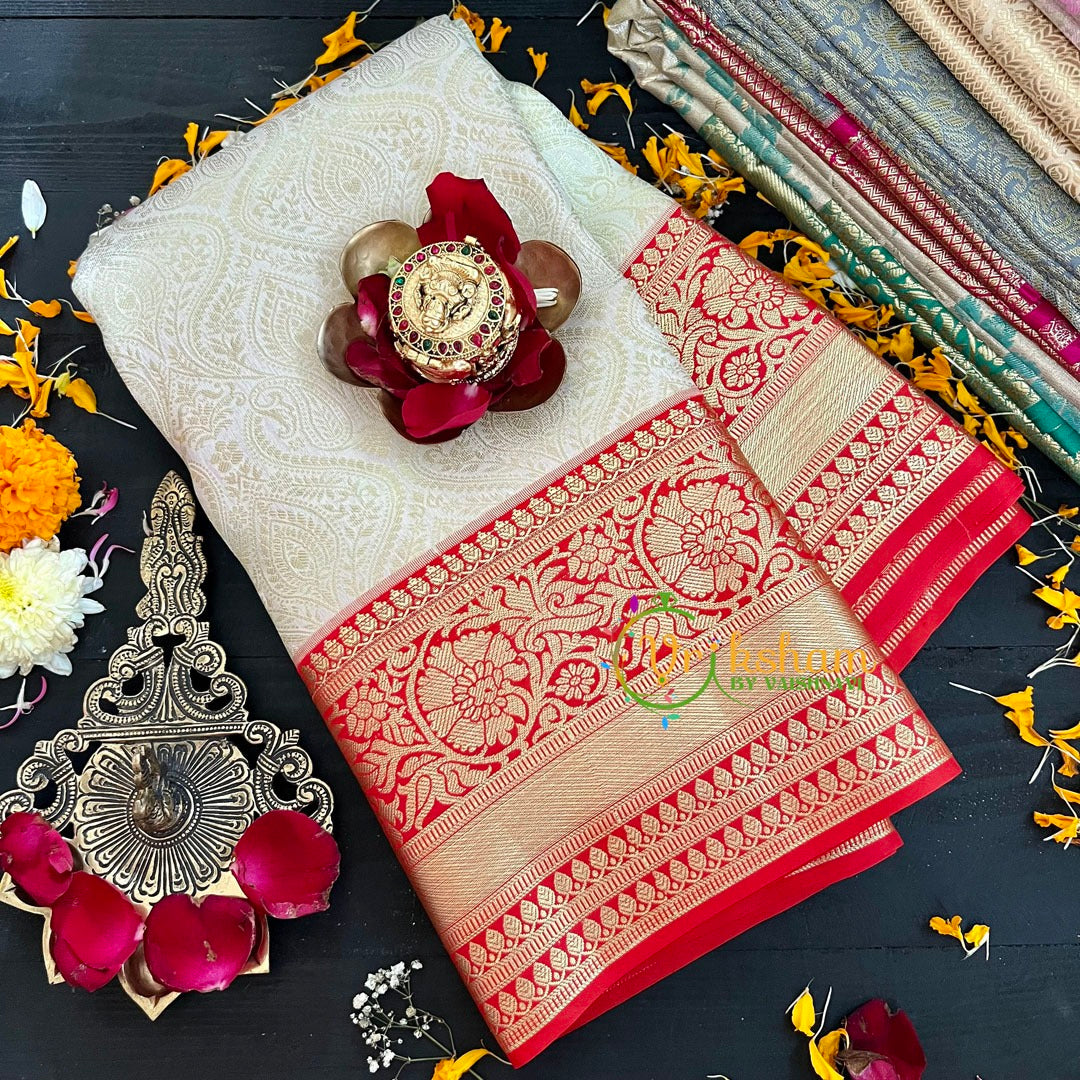 Half White with Red Kanchi Silk Saree – Festive wear saree – Pattern throughout the saree; comes with Blouse attached. One side Big Border and other side lean border. Power loomed saree.