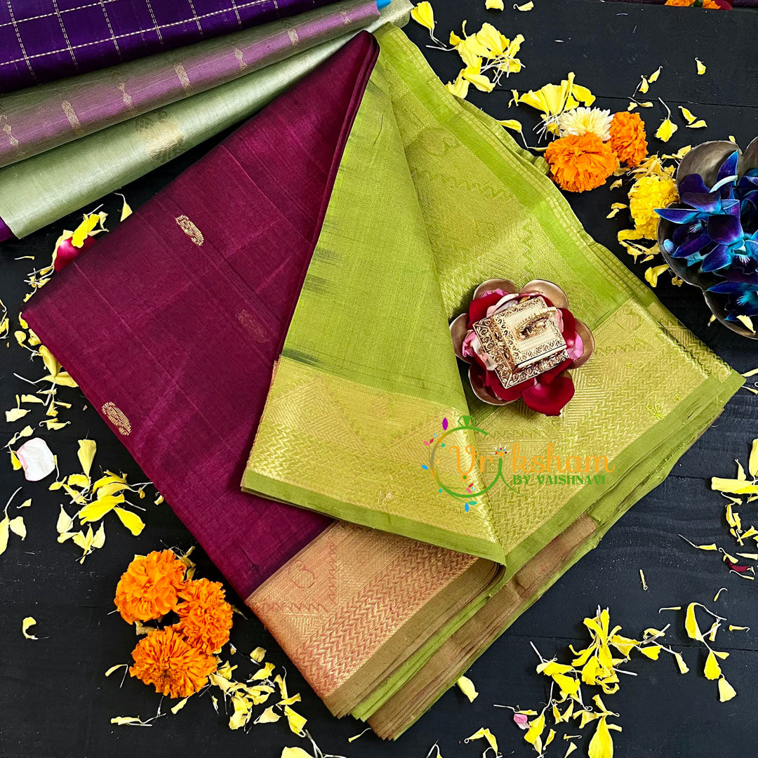 Maroon with Light Green Handloom Silk Cotton Saree– Pattern throughout the saree; comes with Blouse attached. Two side contrast border and pallu.